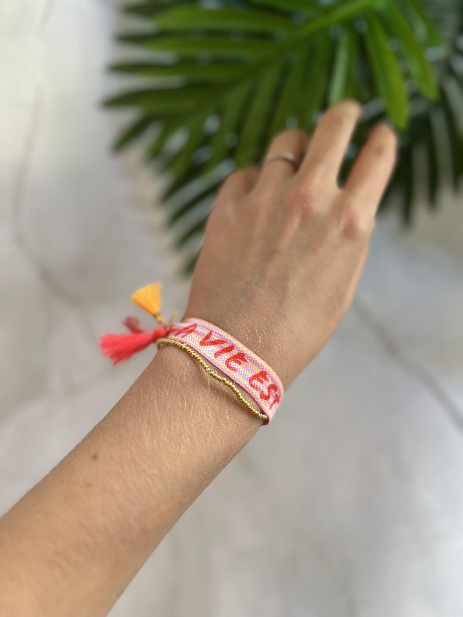 Lebensfroh, farbenfroh und voller guter Laune – dieses Armband-Set vereint ein rosafarbenes Statement-Gummiarmband mit dem inspirierenden Schriftzug La Vie est Belle und zwei verspielten Quasten in Gelb und Pink, dazu ein elegantes goldfarbenes Perlenarmband. Gemeinsam entsteht ein Set, das Optimismus und Lebensfreudeausstrahlt und jedes Outfit aufhellt.